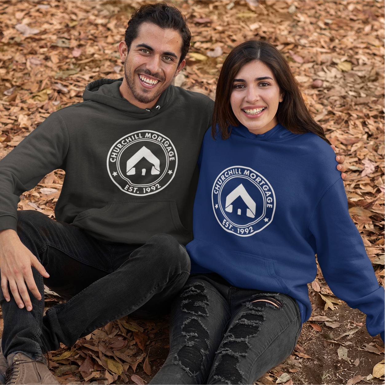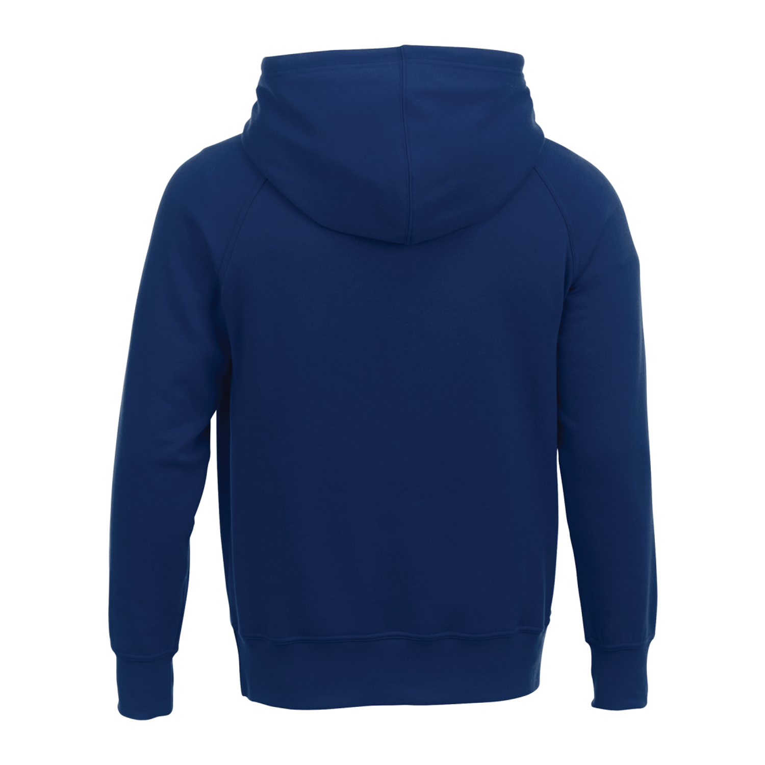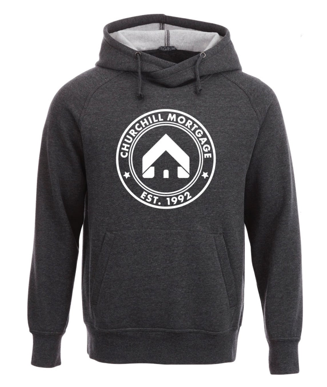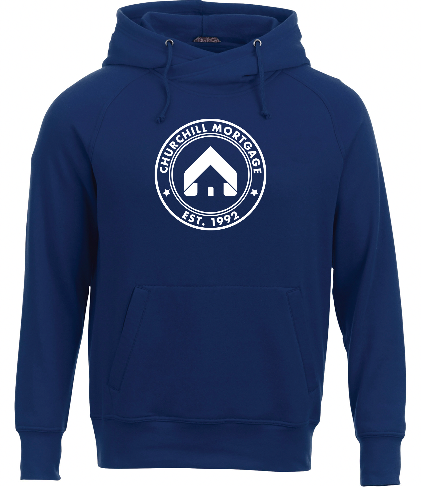 The Dayton Fleece Hoody offers a relaxed look and unique branding opportunities, including an area to put your logo inside the back yoke and tear-away main label, allowing you to create a completely custom piece. Made from a comfy cotton-poly blend, the Dayton has a trendy crossover-front neckline, rib knit cuffs with thumb exits, an interior phone pocket and headphone cord port. Screen printed with Churchill logo in white. 52% Cotton, 48% Polyester. Men's sizing.