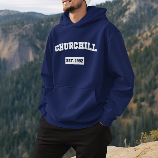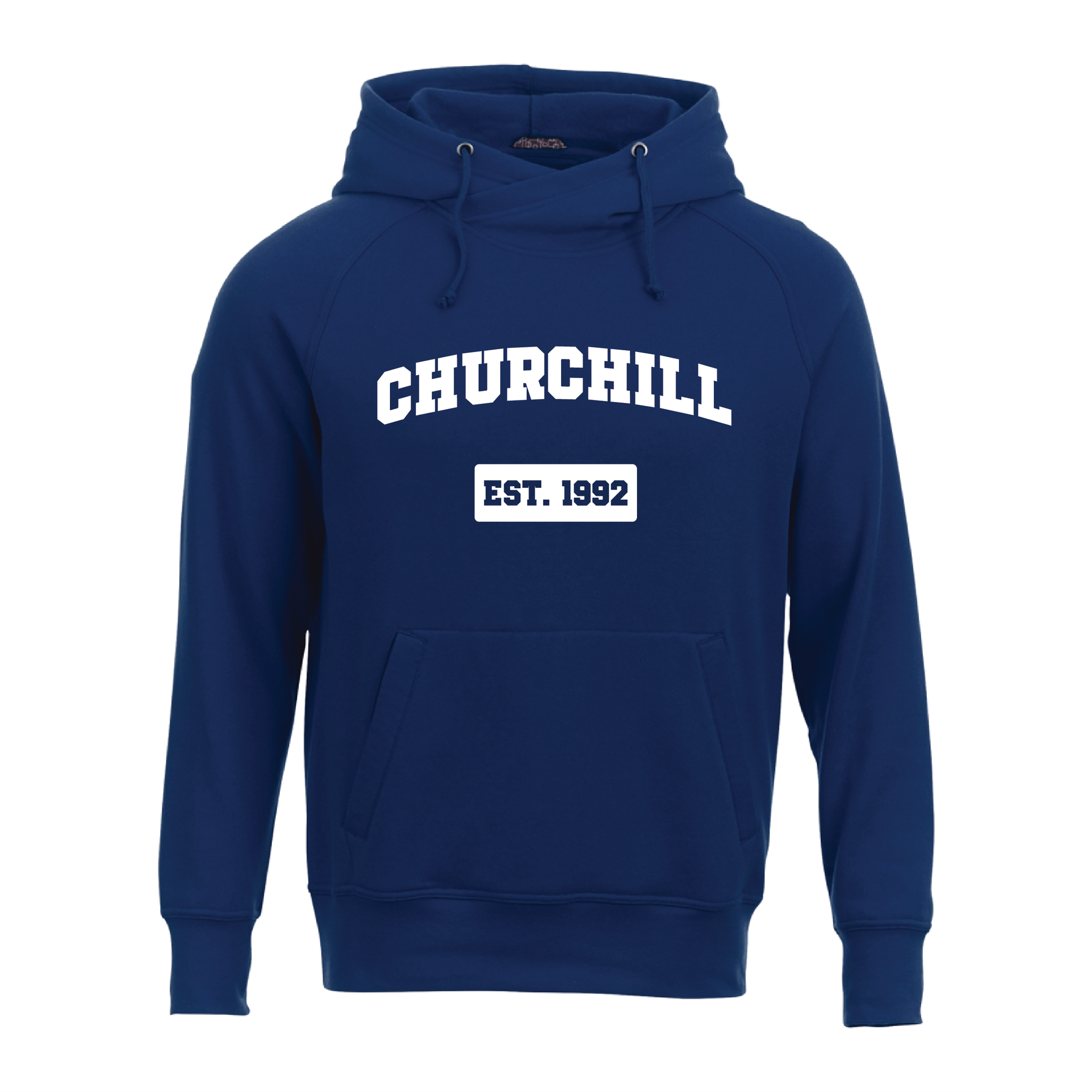 The Dayton Fleece Hoody offers a relaxed look and unique branding opportunities, including an area to put your logo inside the back yoke and tear-away main label, allowing you to create a completely custom piece. Made from a comfy cotton-poly blend, the Dayton has a trendy crossover-front neckline, rib knit cuffs with thumb exits, an interior phone pocket and headphone cord port. Screen printed with Churchill logo in white. 52% Cotton, 48% Polyester. Men's sizing.