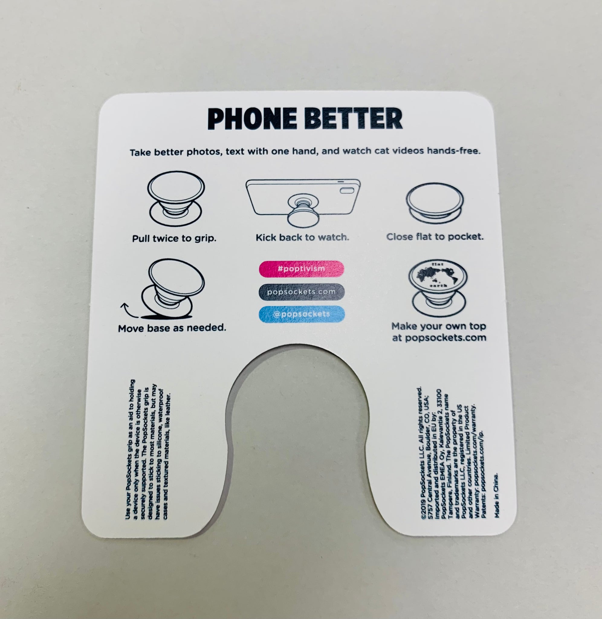 Phone grip & Stand. Pull twice to grip. Kick back to watch. Close flat to pocket. Move base as needed.